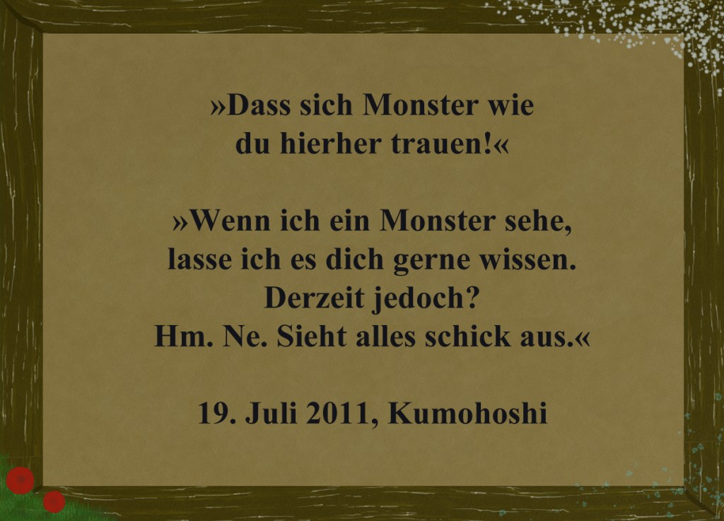 »Nun. Ihr entscheidet: Sind wir zu einem Wortwechsel fähig? Oder sind wir die eigentlichen Monster, die sich lieber dem gegenseitigen Abschlachten verschreiben, ohne dabei an die Zukunft unserer Kinder zu denken?«